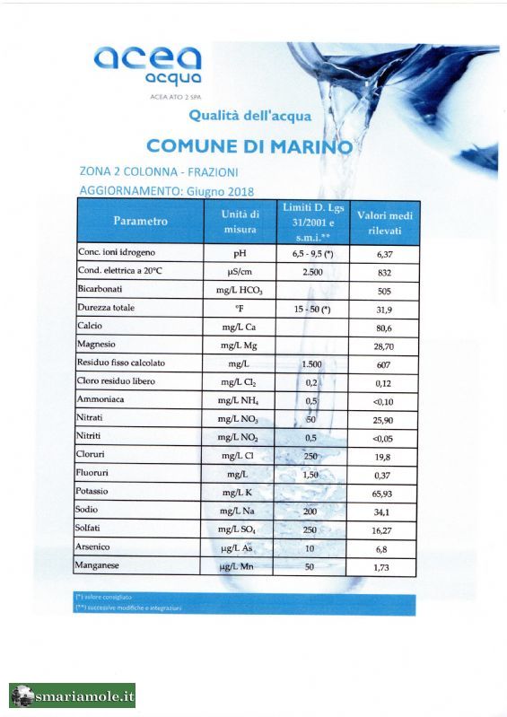 Inoltre, la qualità dell’acqua del rubinetto, pur essendo garantita dagli Enti Istituzionali preposti ai controlli ( ASL e ARPA ), può essere periodicamente verificata dagli stessi utenti (Vedi allegata Scheda “ Qualità dell’Acqua – COMUNE DI MARINO “), accedendo al PORTALE COMUNE MARINO e seguendo, in progressione, i seguenti passaggi: Servizi online; Aree Tematiche; Idrico; Acea acqua – Acea ATO 2 SpA; Bene Prezioso- Scopri la Qualità della tua Acqua – Vai alla Mappa; Digitare il tuo Indirizzo (con Via n. civico e Città); Puntale evidenziante l’area geografica di appartenenza; Cliccare sulla Mappa esternamente al Puntale; Per maggiori informazioni clicca qui; Salvare il file “ Marino zona 2 - Colonna – Frazioni “ e cliccare sulla denominazione dello stesso per evidenziare la “Tabella sulla qualità dell’Acqua COMUNE DI MARINO”.
