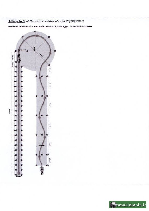 L’esecuzione delle manovre lungo un percorso (Vedi Allegato 1), sui circuiti di prova delimitati da strisce orizzontali, consistente in un esercizio di equilibrio a bassa velocità, poi di slalom, avvitamento ostacolo e frenata, con velocità che da 30 Km/h passa a 50 Km/h, fra coni di altezza non inferiore a 30 cm, dislocati a distanza variabile da m 2.2, 4.0 e 1.0, lungo due corridoi, di cui il primo lungo m 18,2 e largo m2,2 ed il secondo della lunghezza di 25 m e la larghezza di 1,3 m.