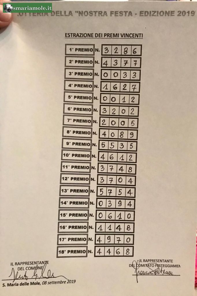 Qui di seguito, vengono riportati i numeri dei biglietti vincenti, estratti alla lotteria della festa patronale in Santa Maria delle Mole del 8 settembre 2019