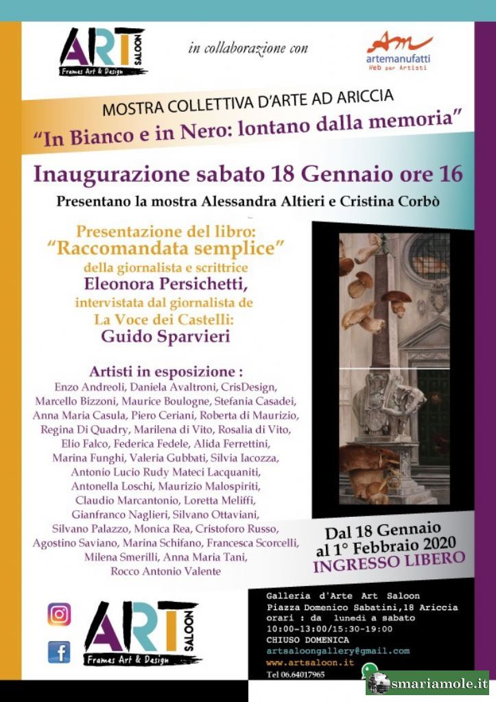 Dopo il successo della Mostra di Natale alla Galleria Art Saloon di Ariccia, sabato 18 gennaio verrà invece inaugurata la mostra “Il Bianco e il Nero, lontano dalla Memoria”. Il tema principale è l’assenza di colori, uno sbiadire come di fotografia antica, raccontare il passato e i ricordi sia nel semplice bianco/nero sia nel rappresentare momenti di vita passati.