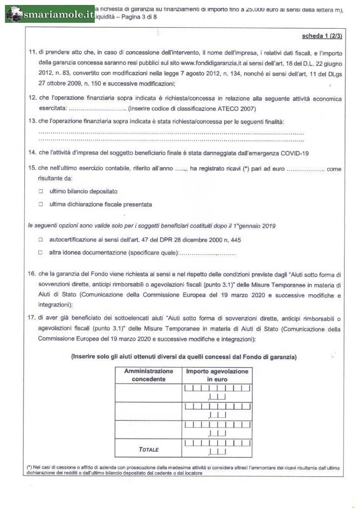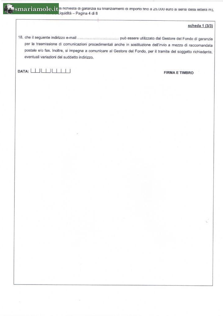 Si precisa infine che, il Modulo, in allegato, per richiedere la garanzia dovrà essere compilato dal beneficiario e trasmesso alla banca o all’Ente finanziatore, anche mediante indirizzo di posta elettronica non certificata, accompagnato da copia di un documento di riconoscimento, in corso di validità, del sottoscrittore.