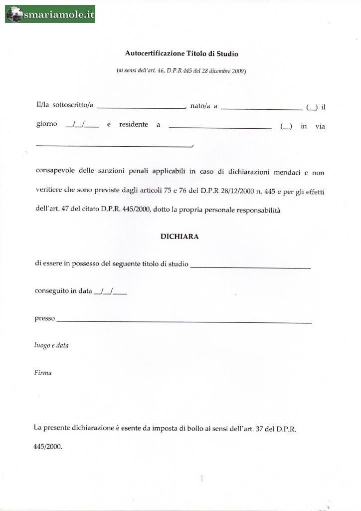 - modello compilato di autocertificazione del titolo di studio (vedi allegato)