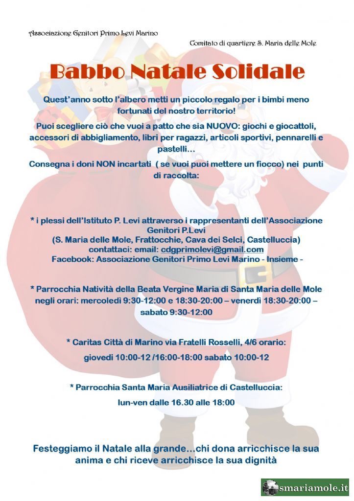 Dalla collaborazione tra Associazione Genitori Primo Levi Marino e il Comitato di Quartiere di Santa Maria delle Mole nasce la raccolta dei regali di Natale per i bambini di tutto il territorio di Marino! Arriva Babbo Natale, portando un carico di doni a tutti i bimbi che non possono riceverli e aiuta le mamme e i papà a far sorridere i propri figli.
