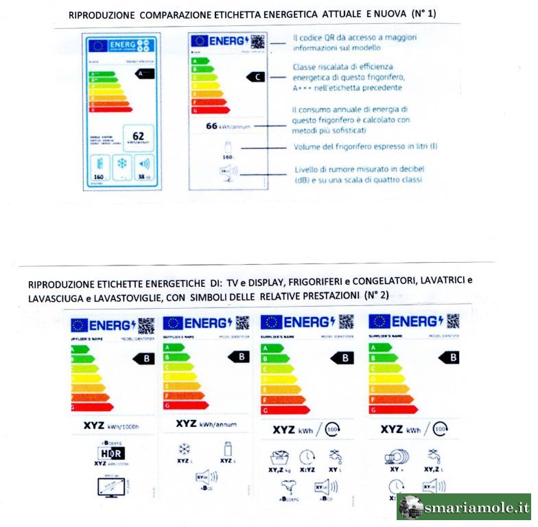 A tal proposito, la recente normativa dispone che: dal 1° novembre 2020 tutti i prodotti devono essere provvisti sia della nuova che della vecchia etichetta (vedi Figura n° 1); dal 1° marzo 2021 la nuova etichetta è obbligatoria per lavastoviglie, lavatrici, asciugatrici, frigoriferi, congelatori, cantinette vino (frigoriferi adatti alla conservazione del vino), TV e monitor; dall’1 Settembre 2021 diventerà obbligatoria anche per tutte le fonti di illuminazione (luci a LED); e che i vecchi modelli potranno avere ancora la vecchia etichetta fino al 30 novembre 2021, mentre sarà rigorosamente vietato vendere elettrodomestici con la vecchia Etichetta dal 1° dicembre 2021.