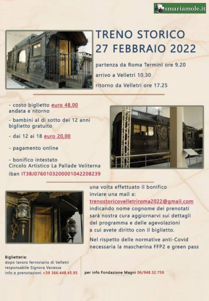 Per informazioni e prenotazioni telefonare al numero 366 44 84 595 oppure scrivere alla mail: trenostoricovelletriroma2022@gmail.com