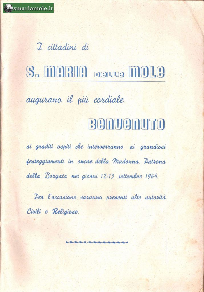 I Cittadini di S. MARIA delle MOLE augurano il più cordiale BENVENUTO ai graditi ospiti che interverranno ai grandiosi festeggiamenti in onore della Madonna Patrona della Borgata nei giorni 12-13 settembre 1964.