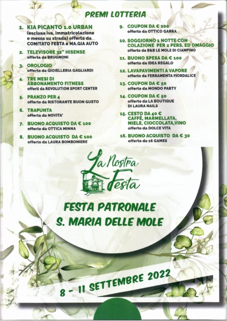 Finalmente, dopo la pandemia, torna la festa di S. Maria delle Mole, “La Nostra Festa 2022”, dall’8 all’11 settembre. Una festa patronale che avrà luogo in “tempi difficili”, come ha sottolineato il parroco don Jesus, ma che sarà anche l’occasione per riunirsi e stare insieme. La Festa è promossa, come sempre, dalla Parrocchia della Natività della Beata Maria Vergine e, d’accordo con il calendario liturgico, coincide con la nascita della mamma di Gesù. A rendere possibile la realizzazione della manifestazione è stato anche l’intervento degli sponsor locali e dell’amministrazione comunale. Il programma è ricco di eventi ed iniziative, sia quello religioso sia quello dei festeggiamenti.