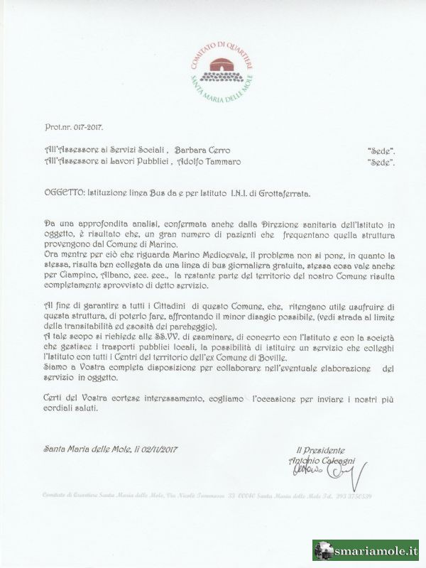 Sulla base di tutto ciò e supportati dal fatto che un servizio di navetta gratuita, dell’Istituto già collegava la struttura sanitaria con numerosi paesi dei Castelli, tra cui appunto Marino, Ciampino, ecc.ecc.., abbiamo chiesto l’estensione di tale servizio anche a Santa Maria, Frattocchie, Cava, Castelluccia, Fontana Sala e Due Santi.