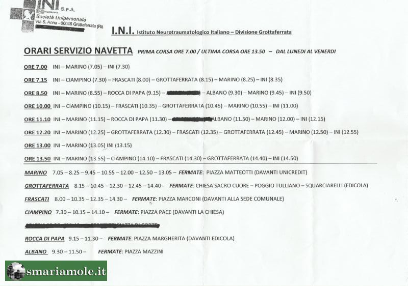 Una proposta che ha riscosso un forte interesse e che per questo è stata portata avanti con un grande impegno,dall’Assessore Cerro, fino a raggiungimento dell’accordo dei giorni scorsi tra INI- Schiaffini e Comune di Marino per l’avvio dal 12-03-2018 di un servizio di navetta da e per l’Istituto con partenza da … Marino, piazza Don Luigi Sturzo.