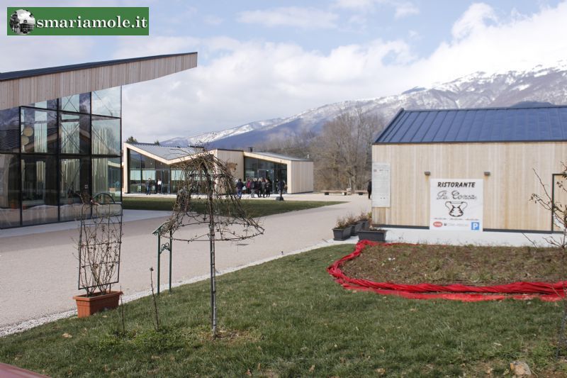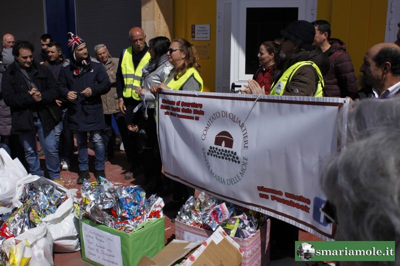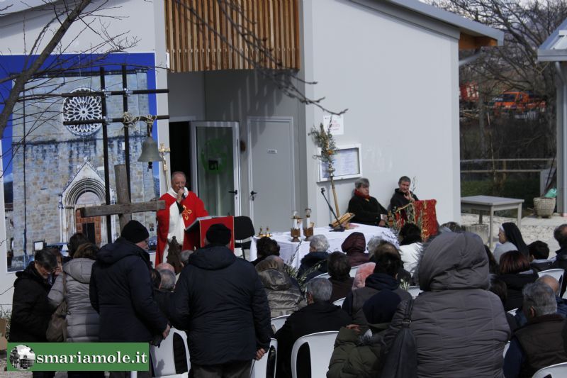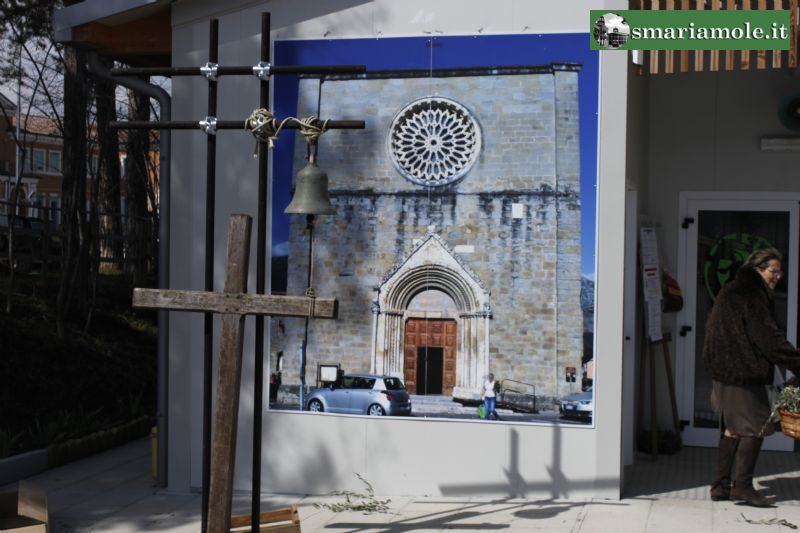 Un parcheggio nella parte più alta, una chiesa ‘temporanea’ con vicino l’immagine della facciata della chiesa crollata, una messa all’aperto, una ‘zona-ristoranti’ costruita tramite contributi da privati, preziosa perché ha garantito l’attività lavorativa agli esercenti locali, un bravo cuoco, qualcuno di noi, la scuola ed il nostro striscione.