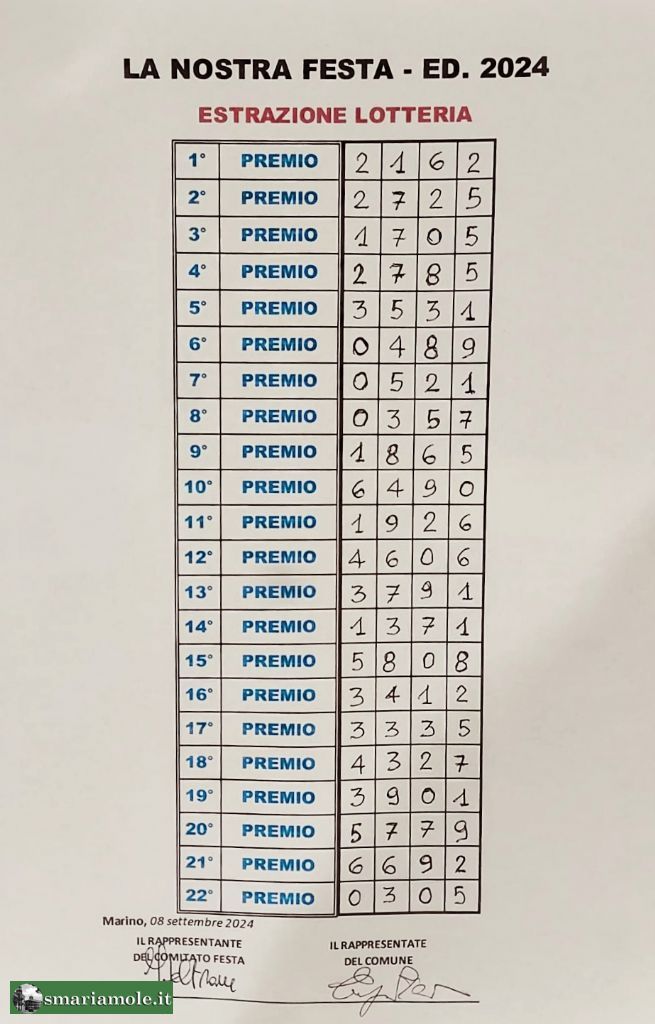 Qui di seguito, vengono riportati i numeri dei biglietti vincenti, estratti alla lotteria della festa patronale in Santa Maria delle Mole del giorno 8 settembre 2024