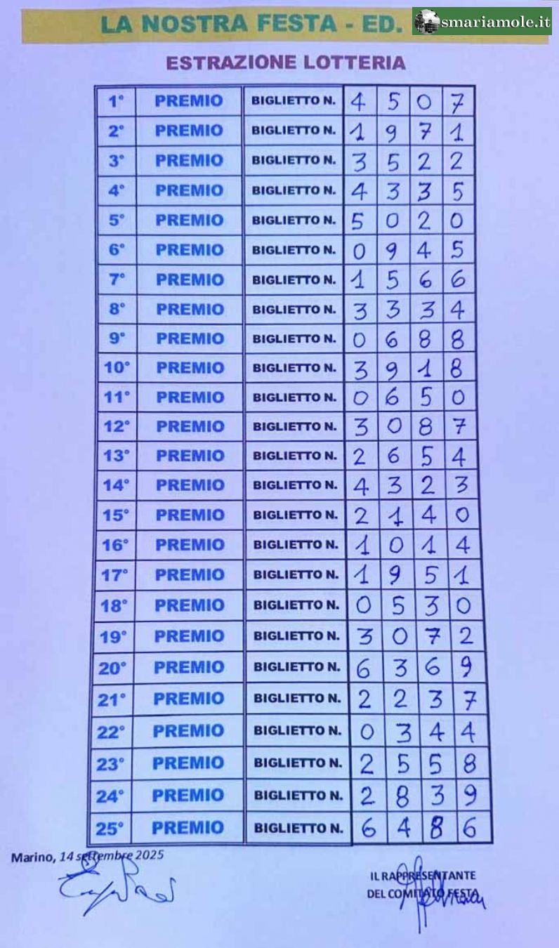 Qui di seguito, vengono riportati i numeri dei biglietti vincenti, estratti alla lotteria della festa patronale in Santa Maria delle Mole del giorno 14 settembre 2025