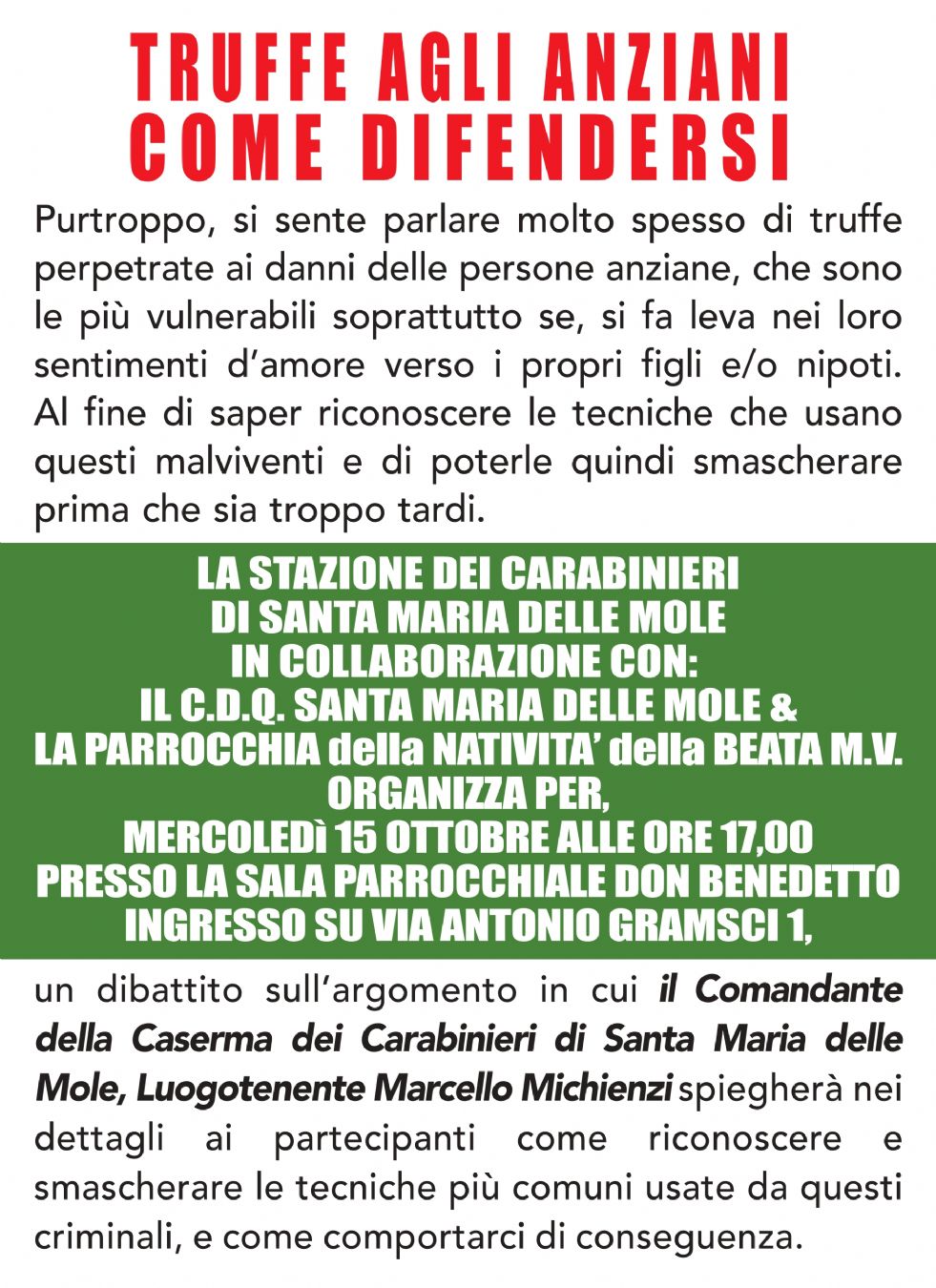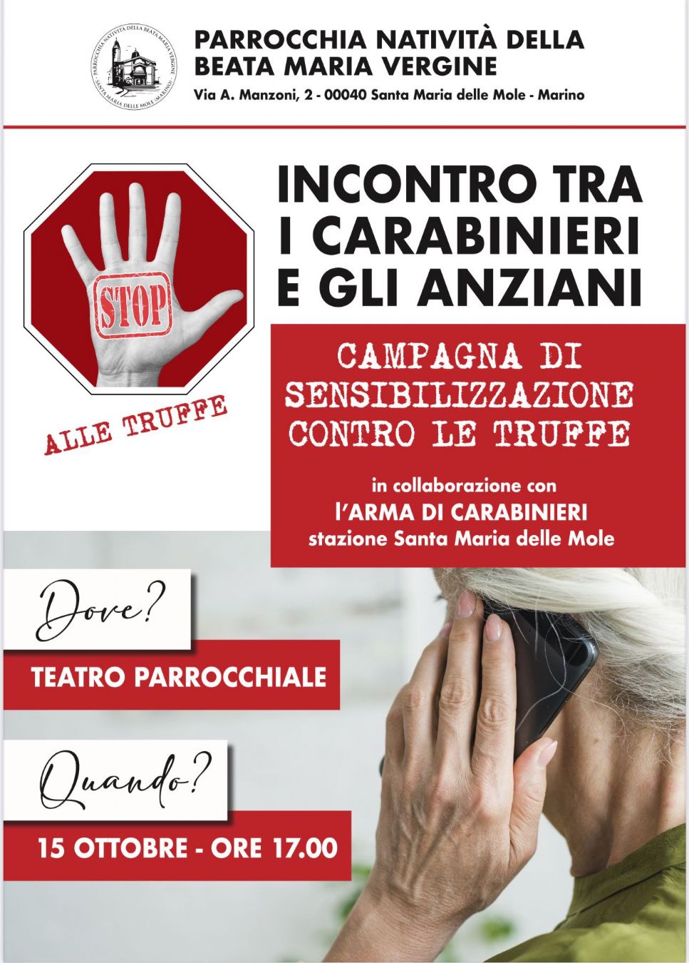 La Stazione dei Carabinieri di Santa Maria delle Mole, in collaborazione con, il Comitato di Quartiere di Santa Maria delle Mole e la Parrocchia della Natività della Beata Maria Vergine, ti invita a partecipare, mercoledì 15 ottobre alle ore 17:00, presso la sala parrocchiale don Benedetto, ingresso su via Gramsci 1, ad un dibattito sull’argomento.
