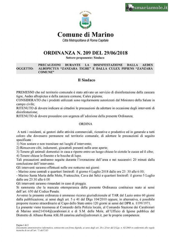 Il sindaco di Marino, con l’Ordinanza n° 209 del 29 giugno 2018, informa i cittadini che nel territorio comunale è stato attivato un servizio per combattere la proliferazione sia della zanzara “Tigre” che quella “Comune”, secondo il seguente calendario: