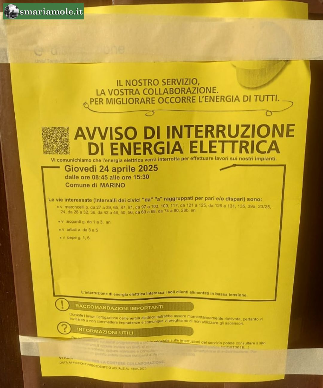 L’ENERGIA ELETTRICA VERRÀ INTERROTTA, CAUSA MANUTENZIONE.